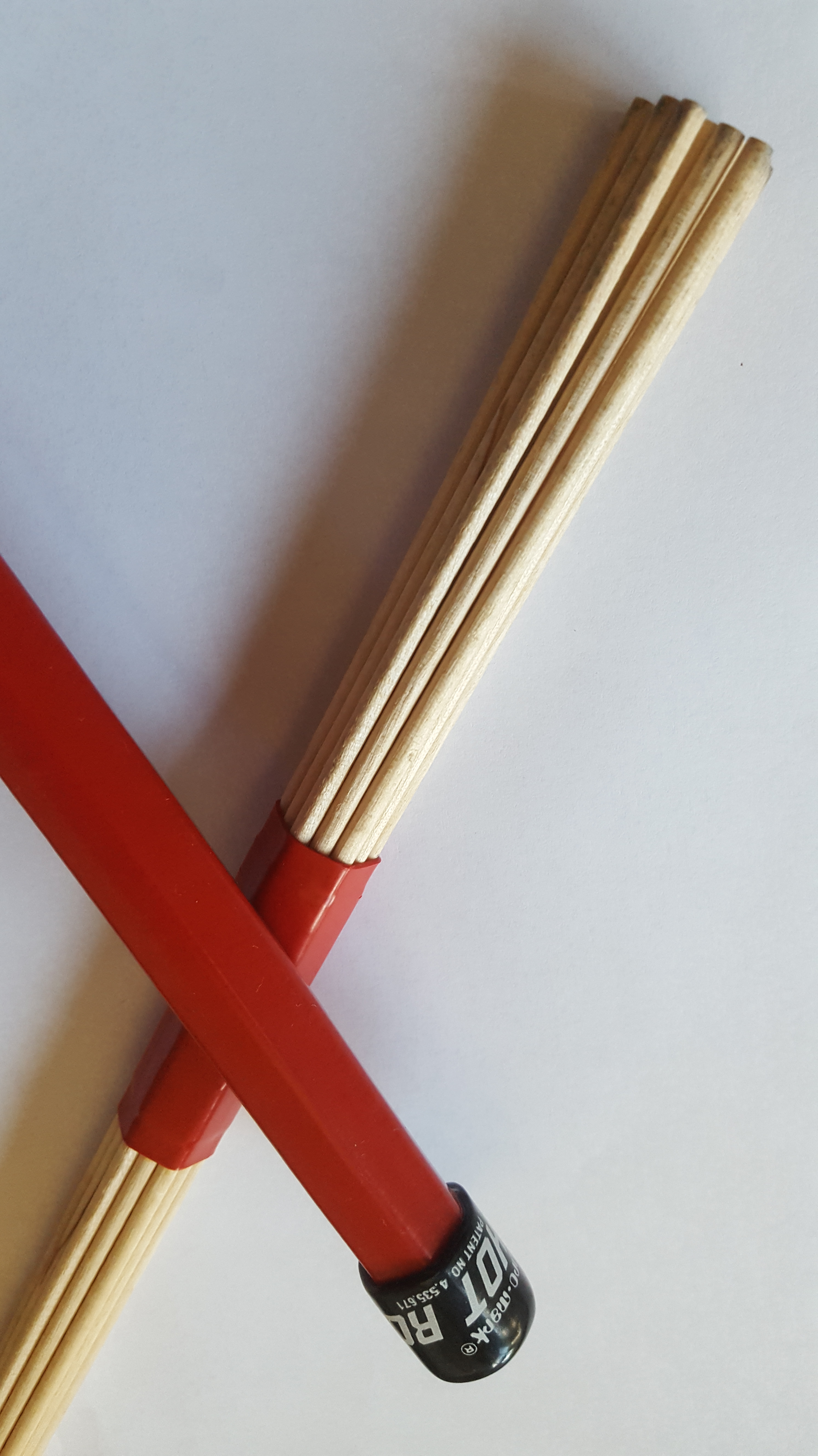 Sounds like something from KFC? These gems are a collection of thin wooden rods that are bound tightly at the end where your hand grips them and widen slightly towards the top. Otherwise known as Thai sticks. Some are bound tighter throughout the length of the stick than others. Many come with narrow rubber bands that can be slid up and down to adjust whether you want the sticks closer together or further apart at the top depending on your preference for a harder more concrete sound or lighter more flexed out one. They are quieter than sticks and a good go-between brushes and sticks volume-wise.