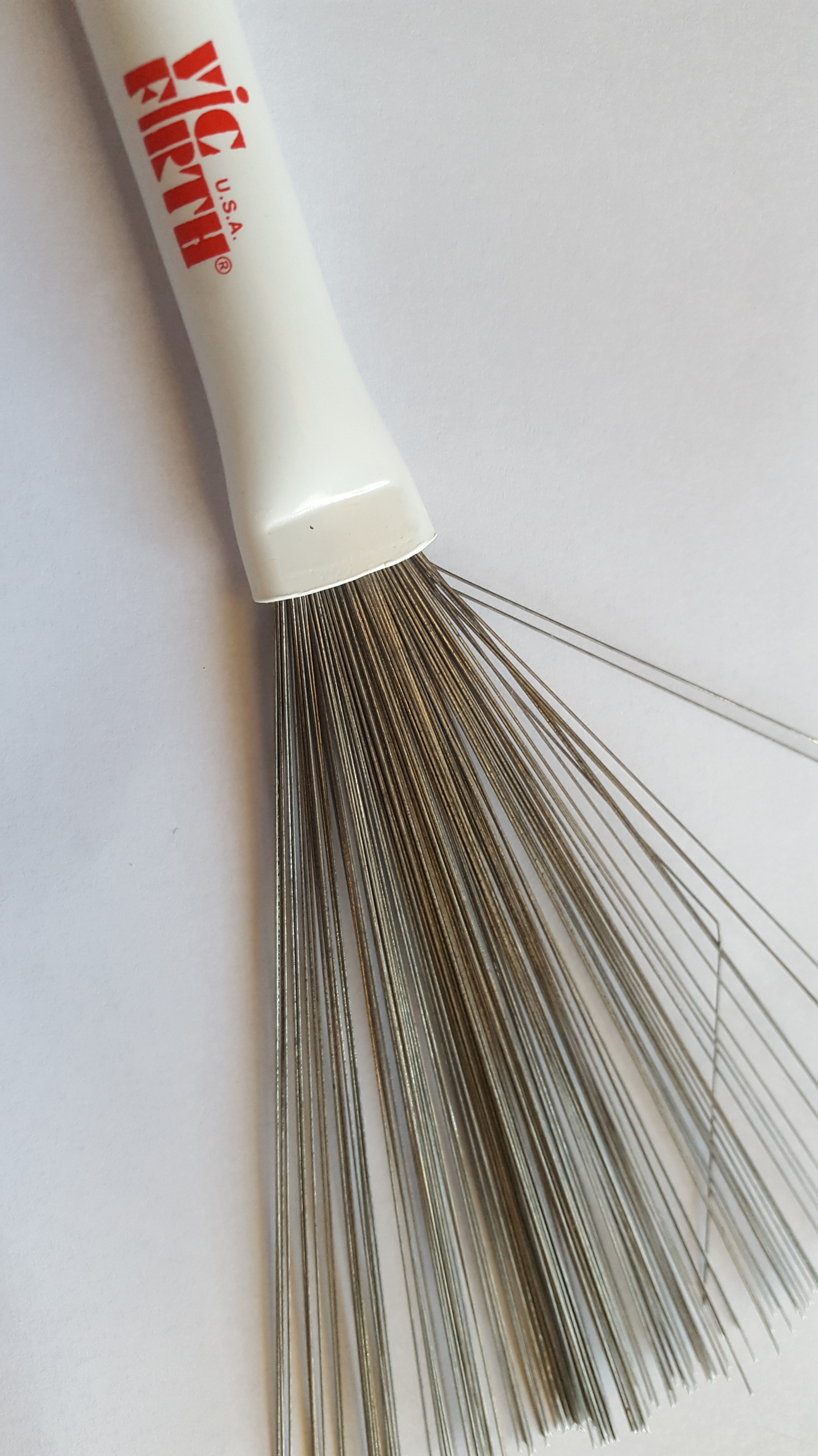 They produce clear ‘swishes’ (for want of a better word!) The wire brushes produce a louder sound on drum heads and cymbals than plastic/nylon brushes. My favourite wire brushes are Vic Firth Jazz brushes, as pictured with the white ends. They have retractable handles (which may require oiling after time as they can become stiff with being pushed in and out.) With retractable handles you can choose how far in or out you want the brushes to be depending on how light or heavy you choose the brush sound to produce. This particular make do have heavier handles than cheaper wire brushes so bear in mind the weight if the drummer is a young learner, for example. You can buy cheaper wire brushes but you do get what you pay for, so rather than going through 3 cheaper brush pairs it makes more sense to buy one pair of excellent quality wire brushes which will last better long-term.
