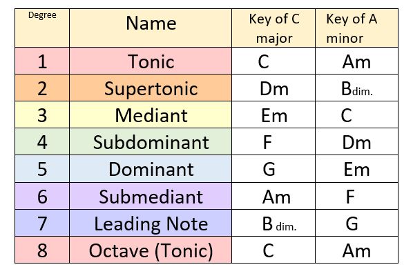 A perfect cadence (or perfect chord resolve) may be referred to as a 5-1 chord or ‘dominant-tonic’ rather than stating letters (for example, G-C in the key of C major). For this reason, it is worthwhile knowing and being able to identify these titles given when learning music theory. The names of the degrees never change so can be used in any key. Examples below are shown for C major and A minor.